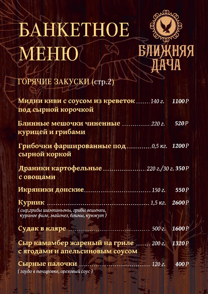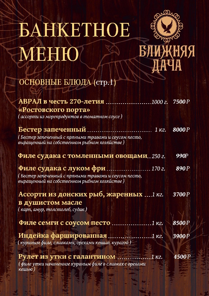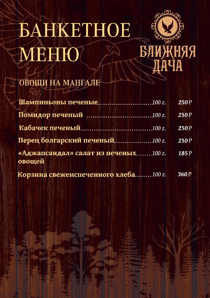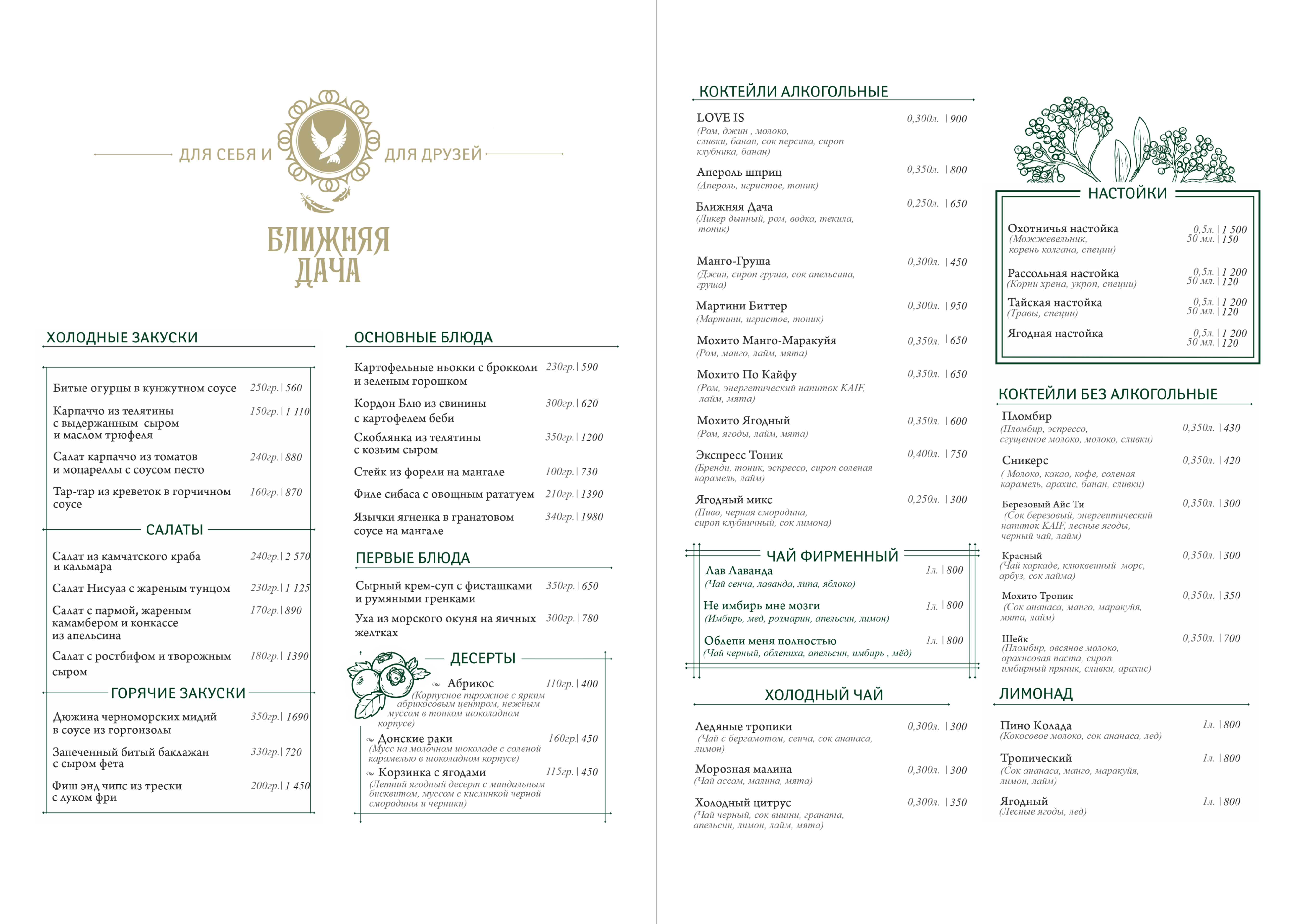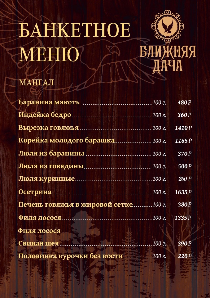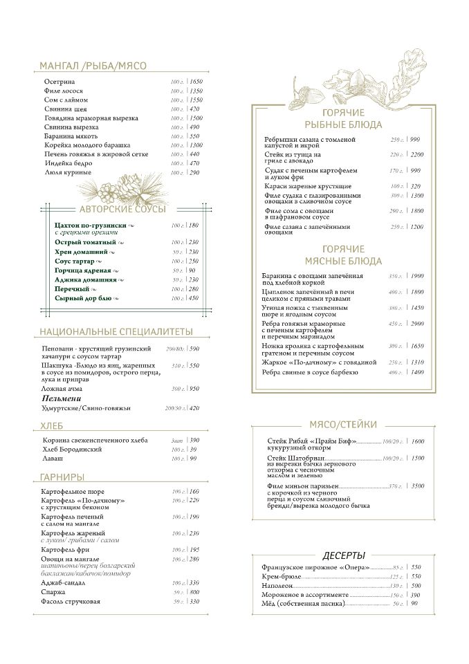 В меню представлены блюда русской, европейской и кавказской кухни, а также блюда, приготовленные на мангале.