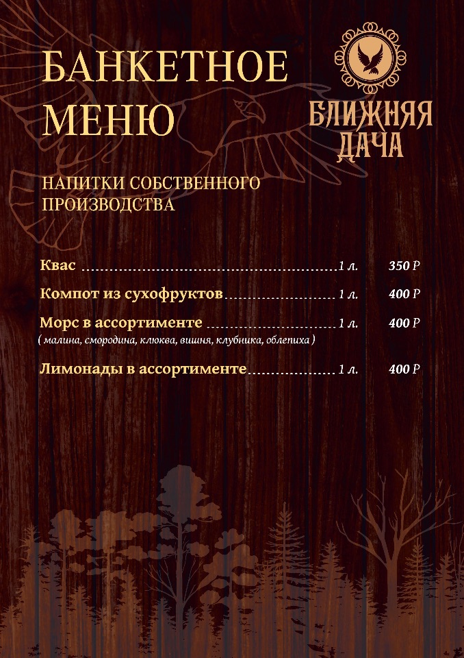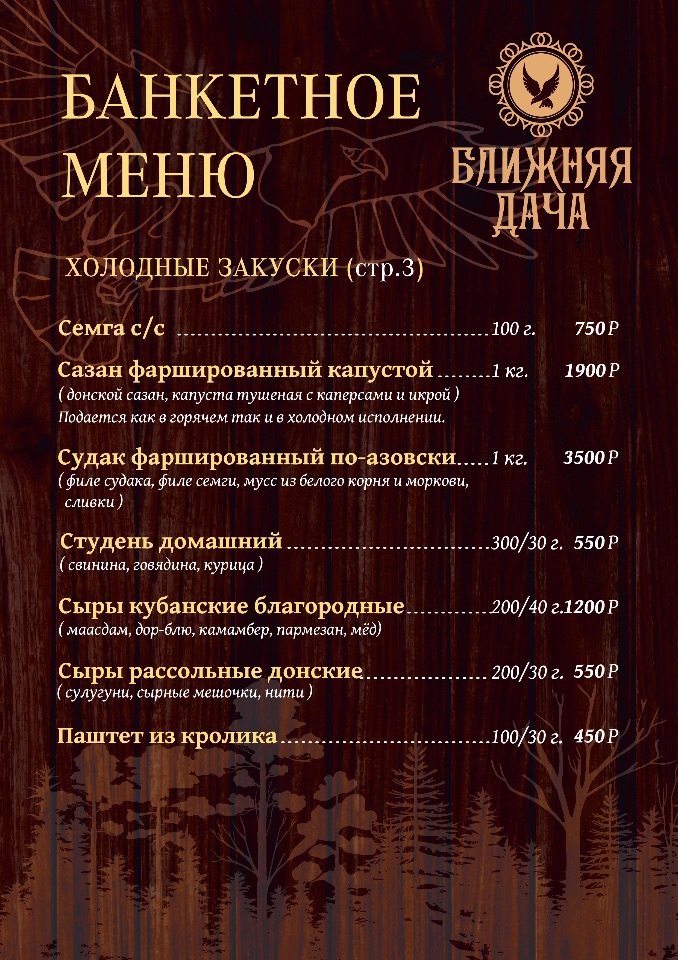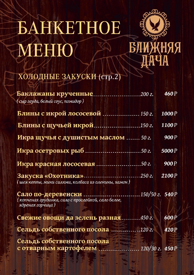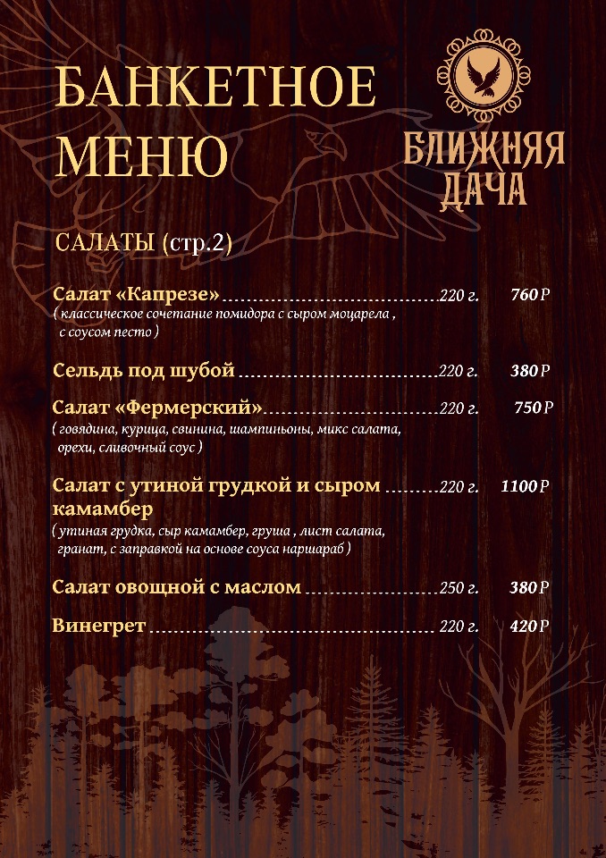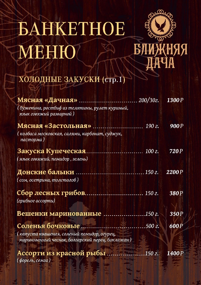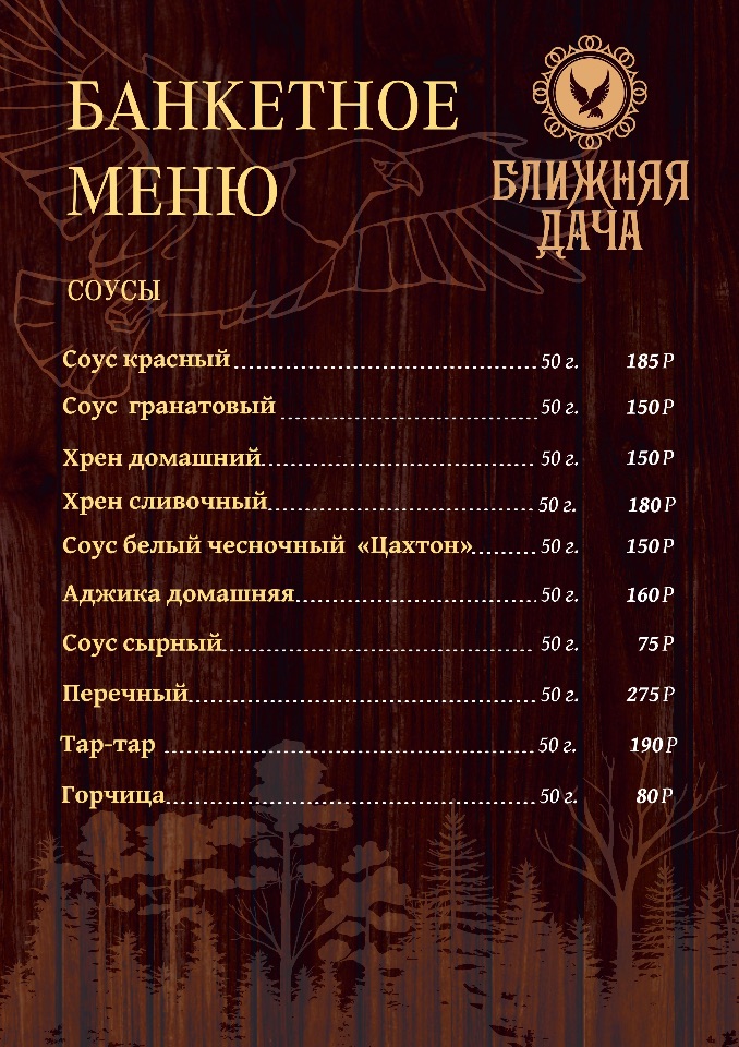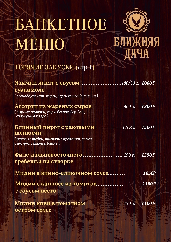 В меню представлены блюда русской, европейской и кавказской кухни, а также блюда, приготовленные на мангале.