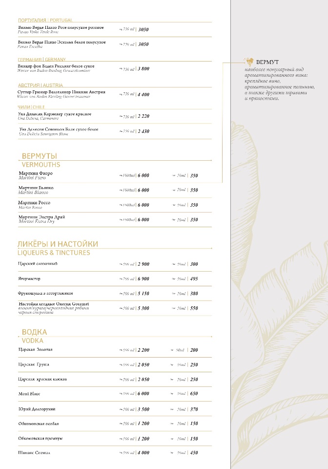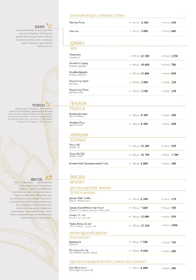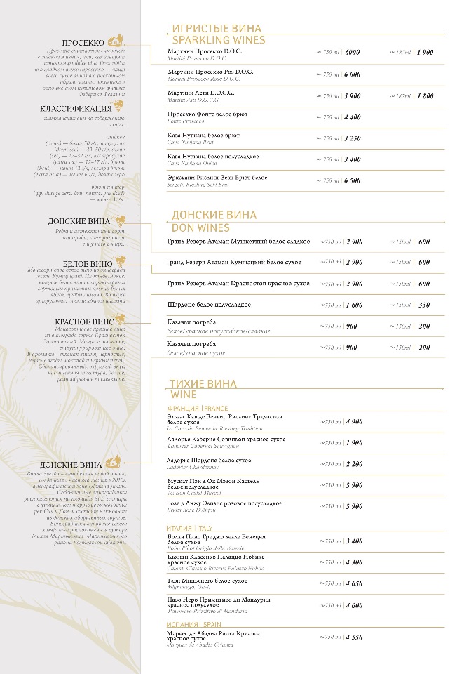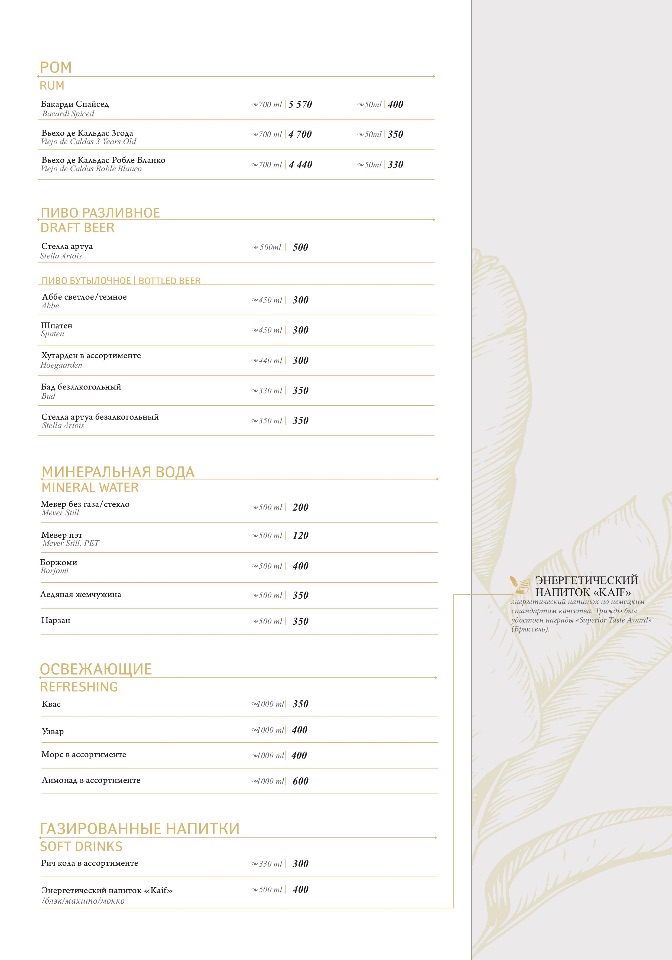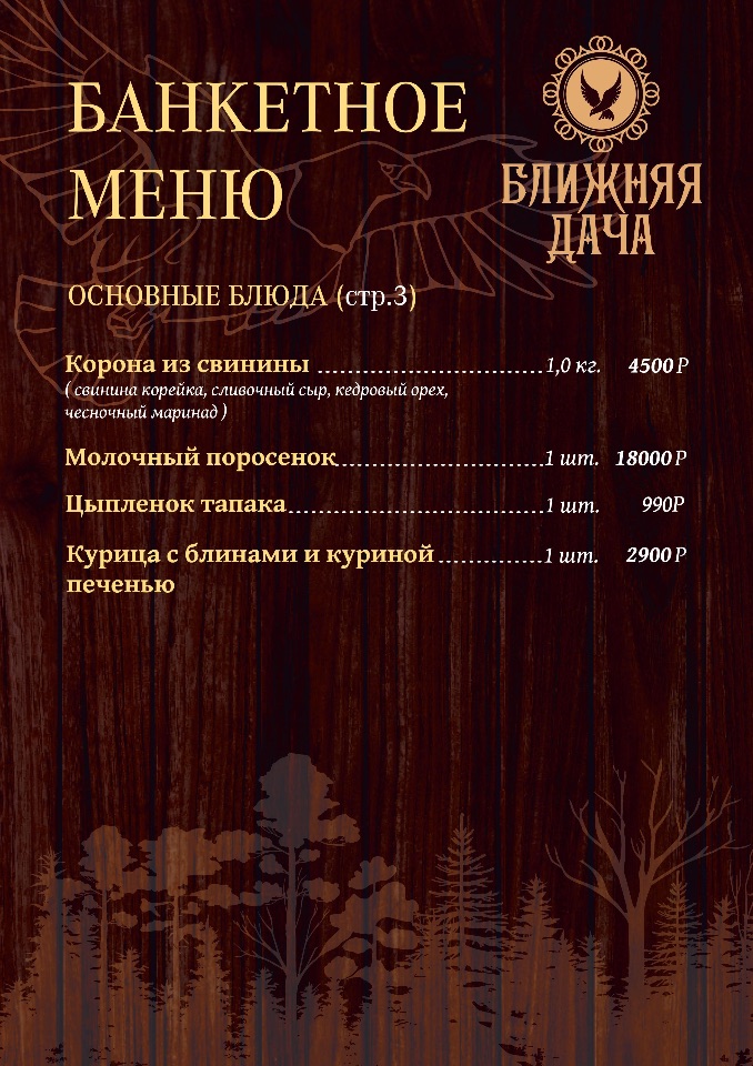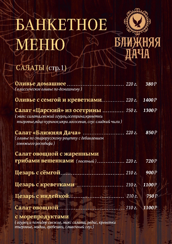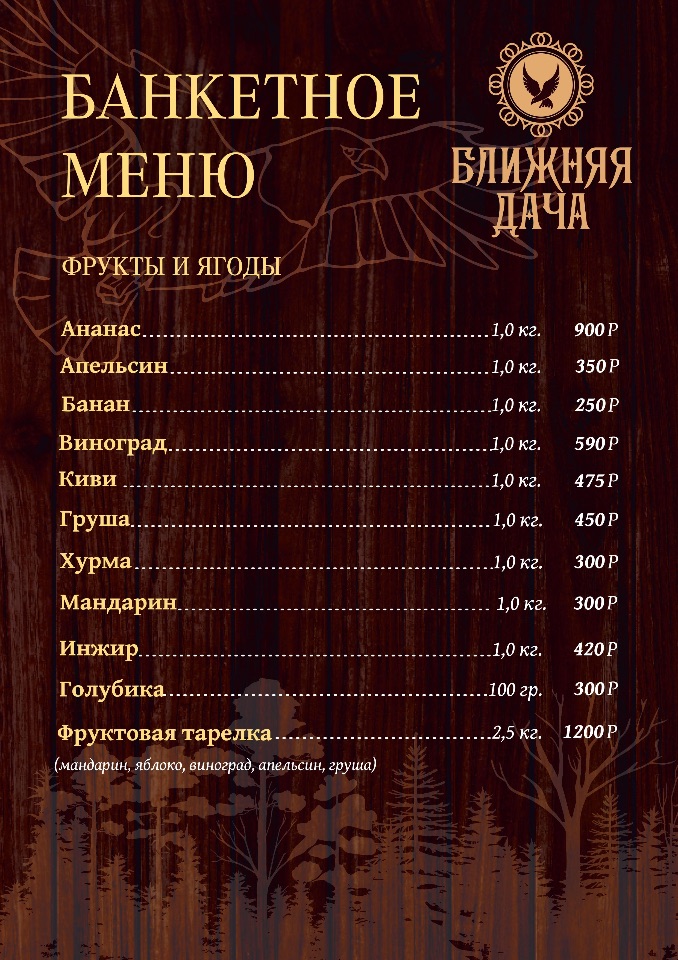 В меню представлены блюда русской, европейской и кавказской кухни, а также блюда, приготовленные на мангале.